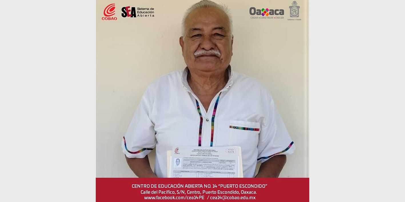 Santa Cruz Xoxocotlán, Oax. 31 de agosto de 2022.- Clodualdo Efrén Sánchez Santiago, a sus 70 años concluyó su Educación Media Superior en el Centro de Educación Abierta (CEA) 14 Puerto Escondido del Colegio de Bachilleres del Estado de Oaxaca (Cobao).