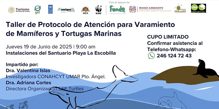 Oaxaca de Juárez Oax. 10 de junio de 2025.- La Secretaría de Medio Ambiente, Biodiversidad, Energías y Sostenibilidad impartirá el próximo 19 de junio, el taller de Protocolo de atención para varamiento de mamíferos y tortugas marinas, con el fin de fortalecer conocimientos y capacidades técnicas para la atención, rescate y manejo de estas especies.