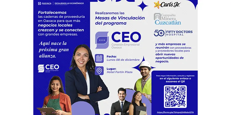 Oaxaca de Juárez, Oax. 2 de diciembre de 2025.- La Secretaría de Desarrollo Económico (Sedeco) invita a las Micro, pequeñas y medianas empresas (Mipymes), así como personas emprendedoras, a participar en las Mesas de Vinculación del programa Conexión Empresarial Oaxaca (CEO), que se realizarán el próximo 8 de diciembre a las 8:30 horas en el Hotel Fortín Plaza.